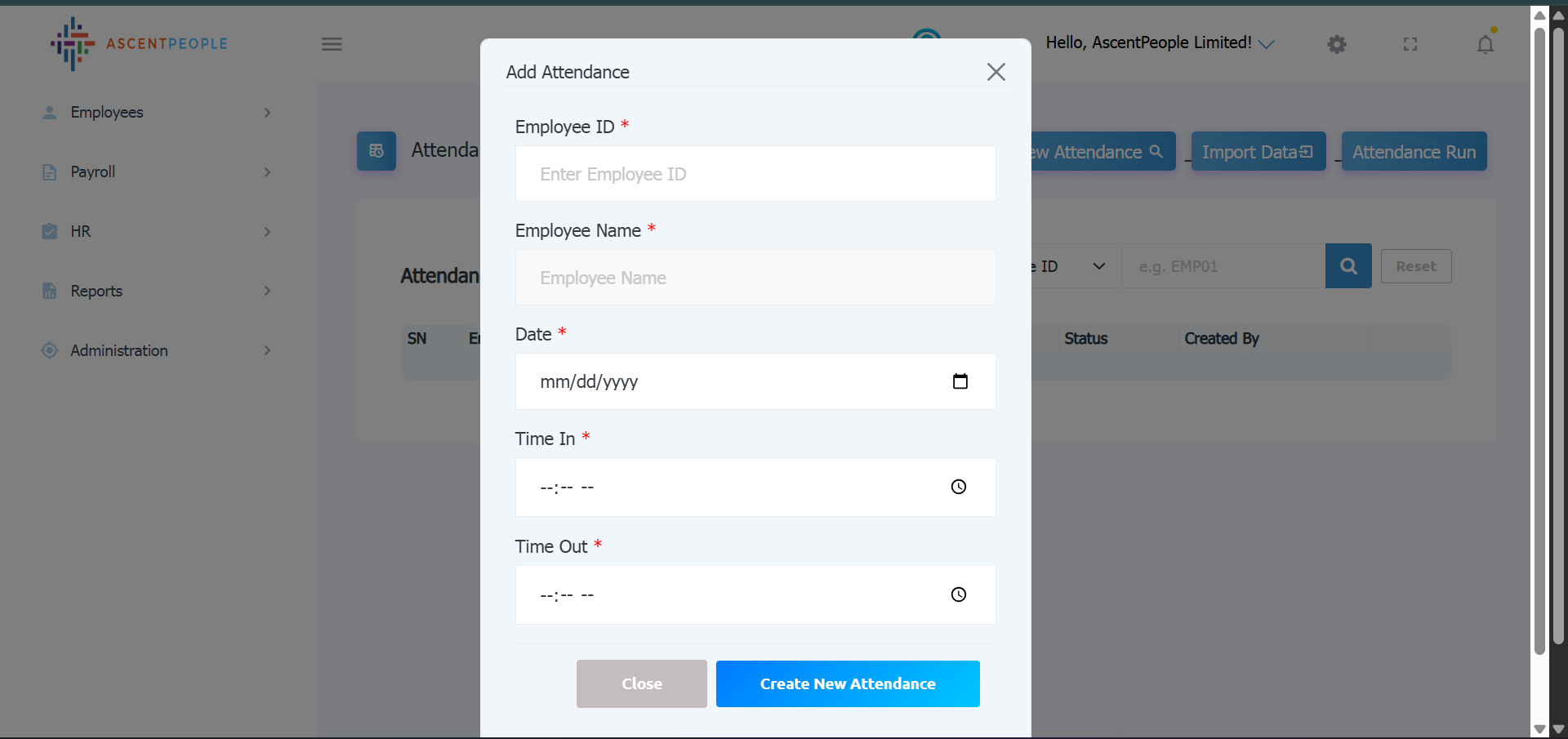 Enter the Employee ID, Employee Name, Date, Time in and time out, then create new attendance (Manual attendance).