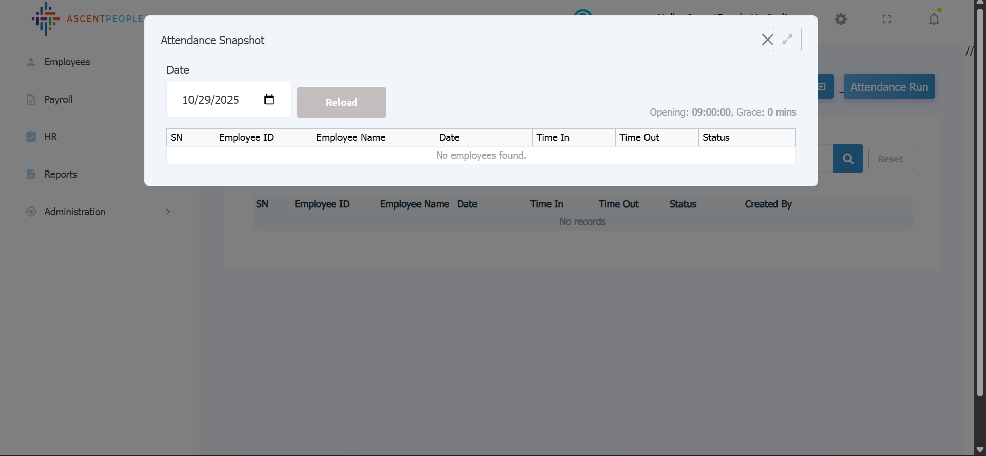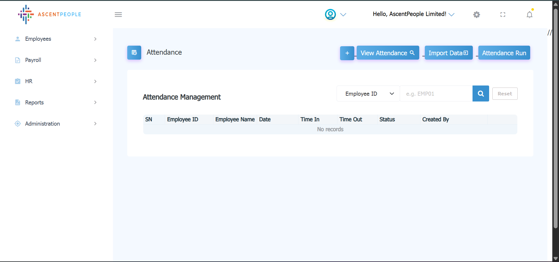 i. Attendance can be added using the plus button. Bulk attendance data can be added using the import data button, view attendance can be used to see bulk attendance data, attendance run button can be used for the attendance run engine.