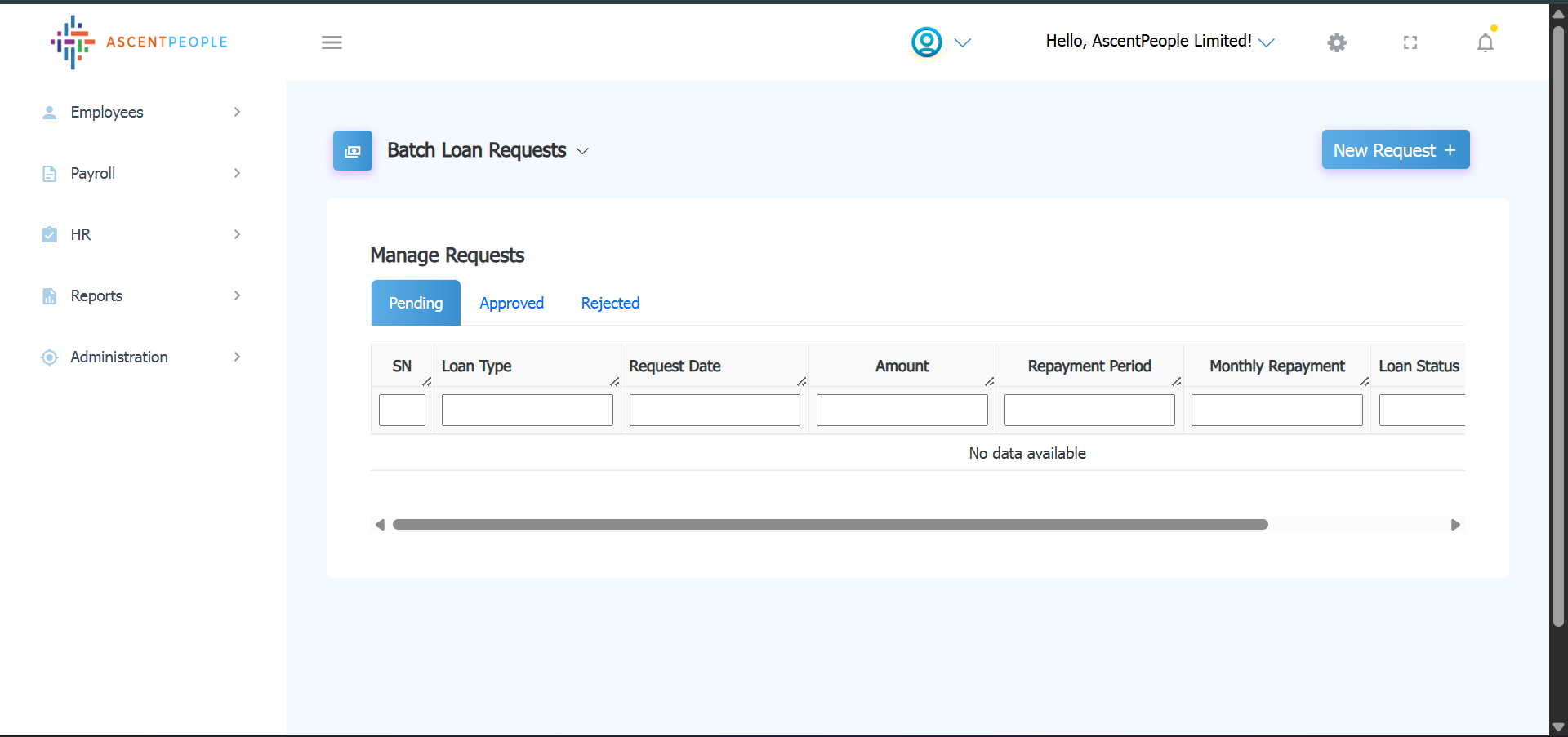 Batch loan requests come to this page and can be approved or rejected. The tabs are to see the pending, approved and rejected loan requests, click on the new request modal to open the batch loan request modal.