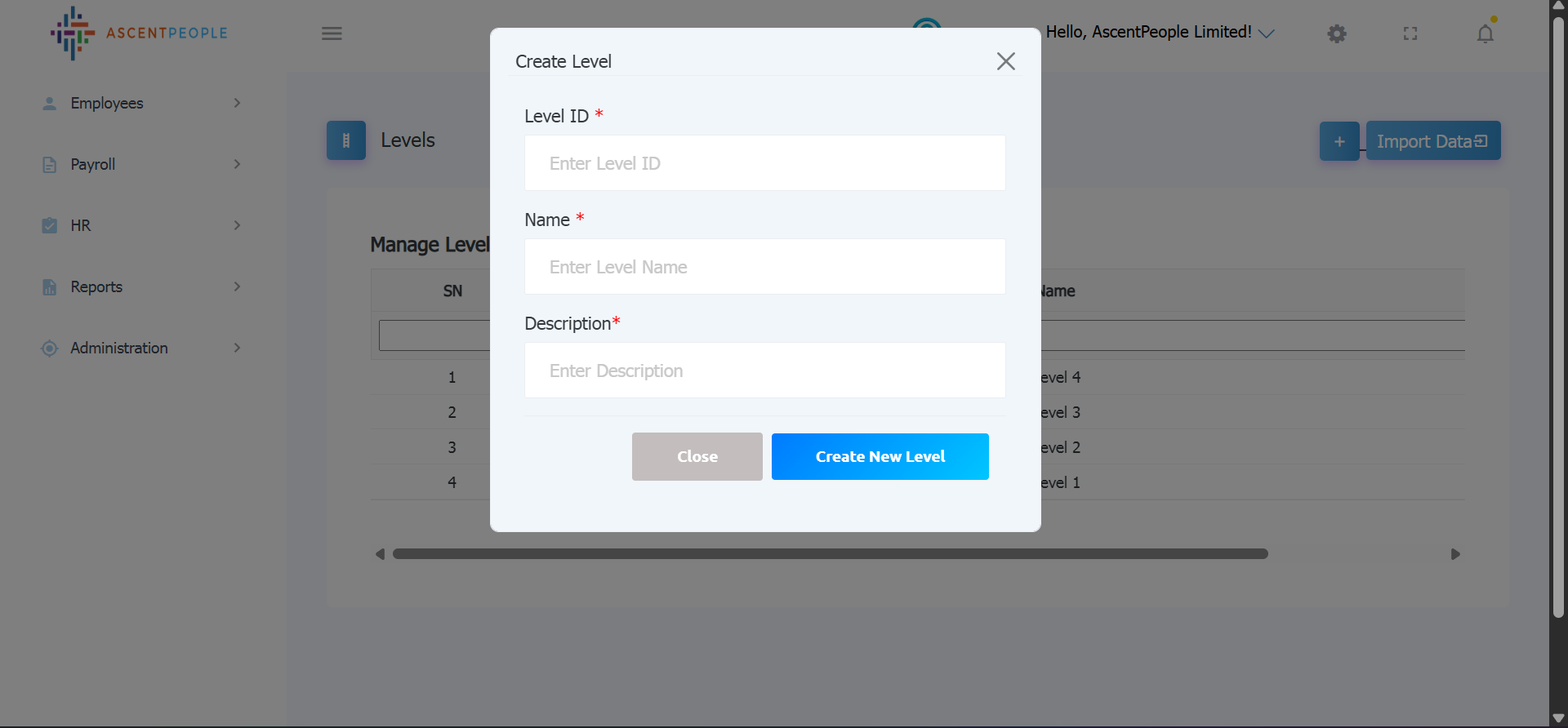 Download the sample file and add the employee you want to import in the downloaded file format then upload the level(s).