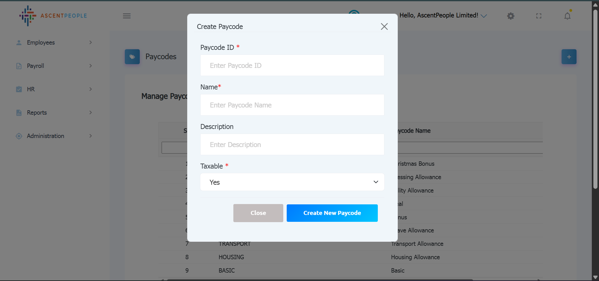 Enter the Paycode ID, Paycode Name, Description, select yes is the paycode is taxable and no if not taxable, then create the paycode.