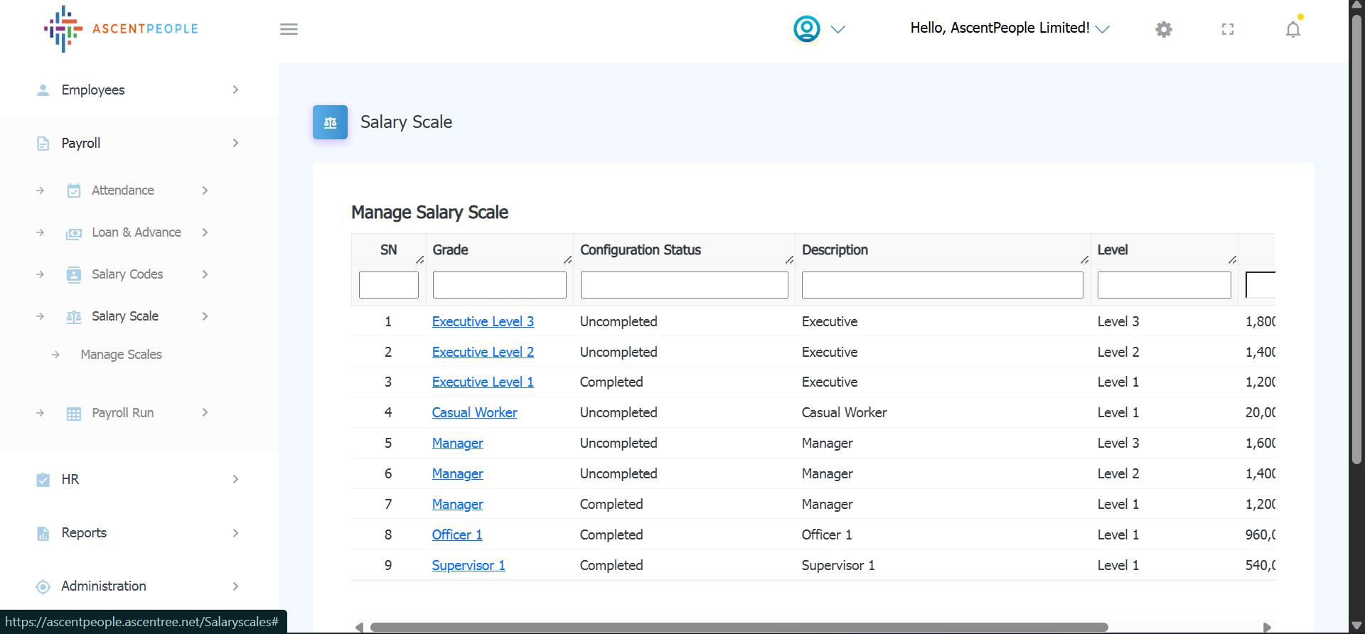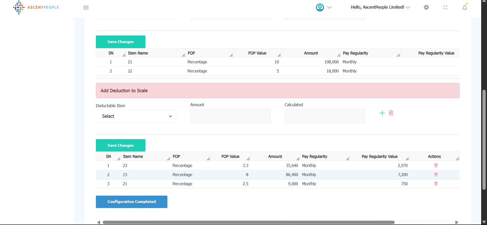 iii. Click on configuration completed to save the configuration. It is then marked as completed on the salary scale table list.