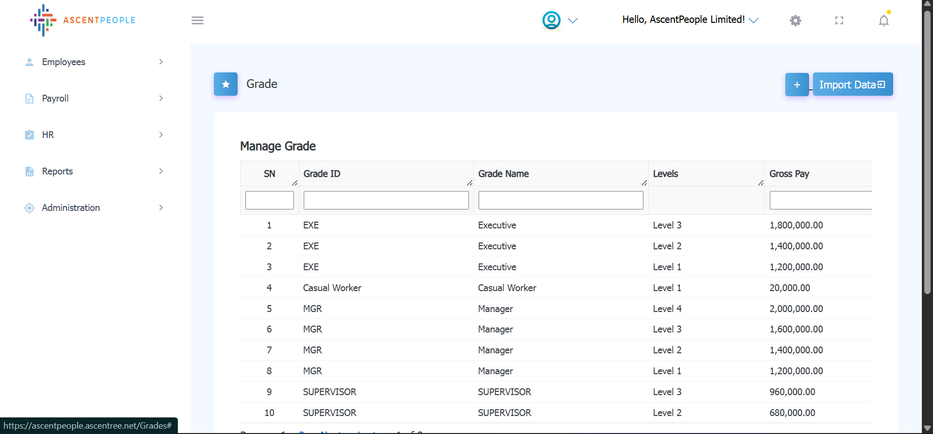 Enter Grade ID, Grade Name, Description, select level and the gross pay (multiple levels with the respective gross pay can be added with the plus icon), Then add the new grade.