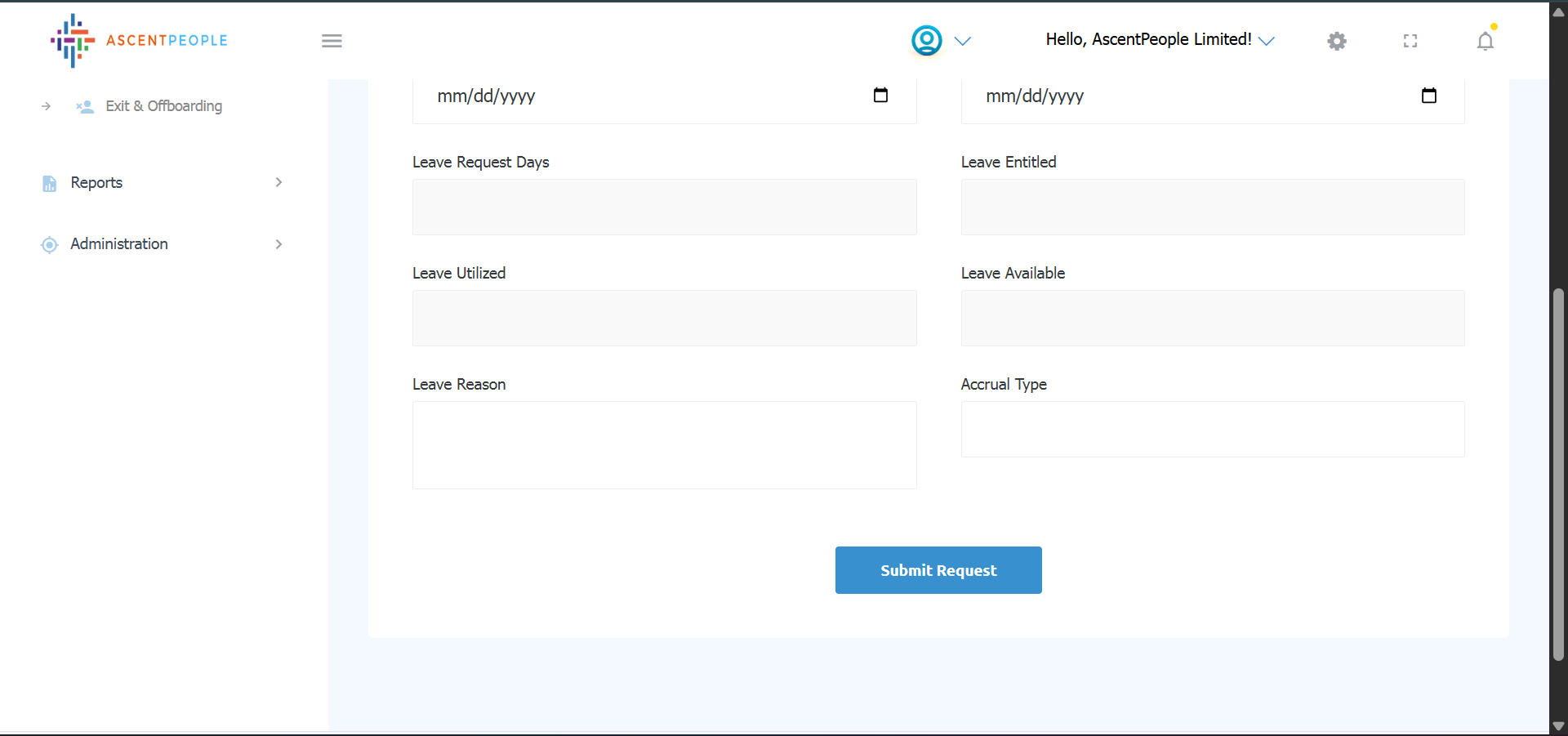 Once Employee No is set, Employee Name, Department, Branch are auto populated. Select the Leave Category, Expected start date and Expected end date, Leave Request days, then the following are auto filled (leave entitled, leave utilized and leave available), Type the leave reason, Accrual type, then submit the request.