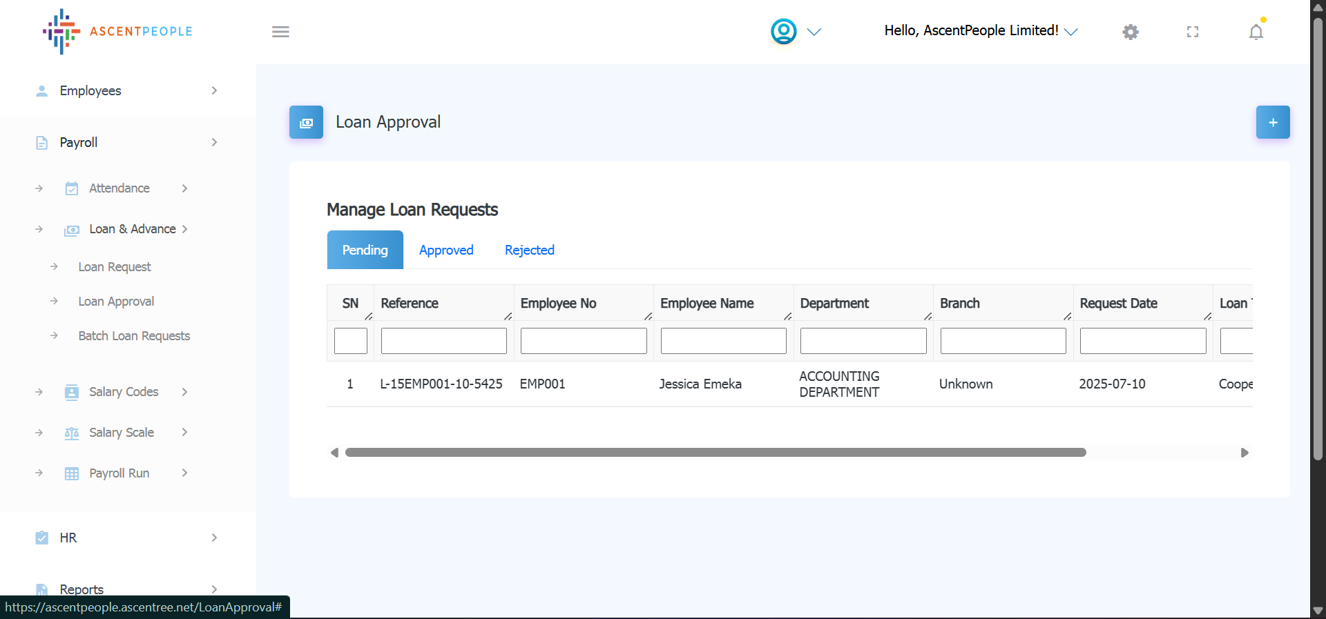 Requests come to this page and can be approved or rejected. The tabs are to see the pending, approved and rejected loan requests.