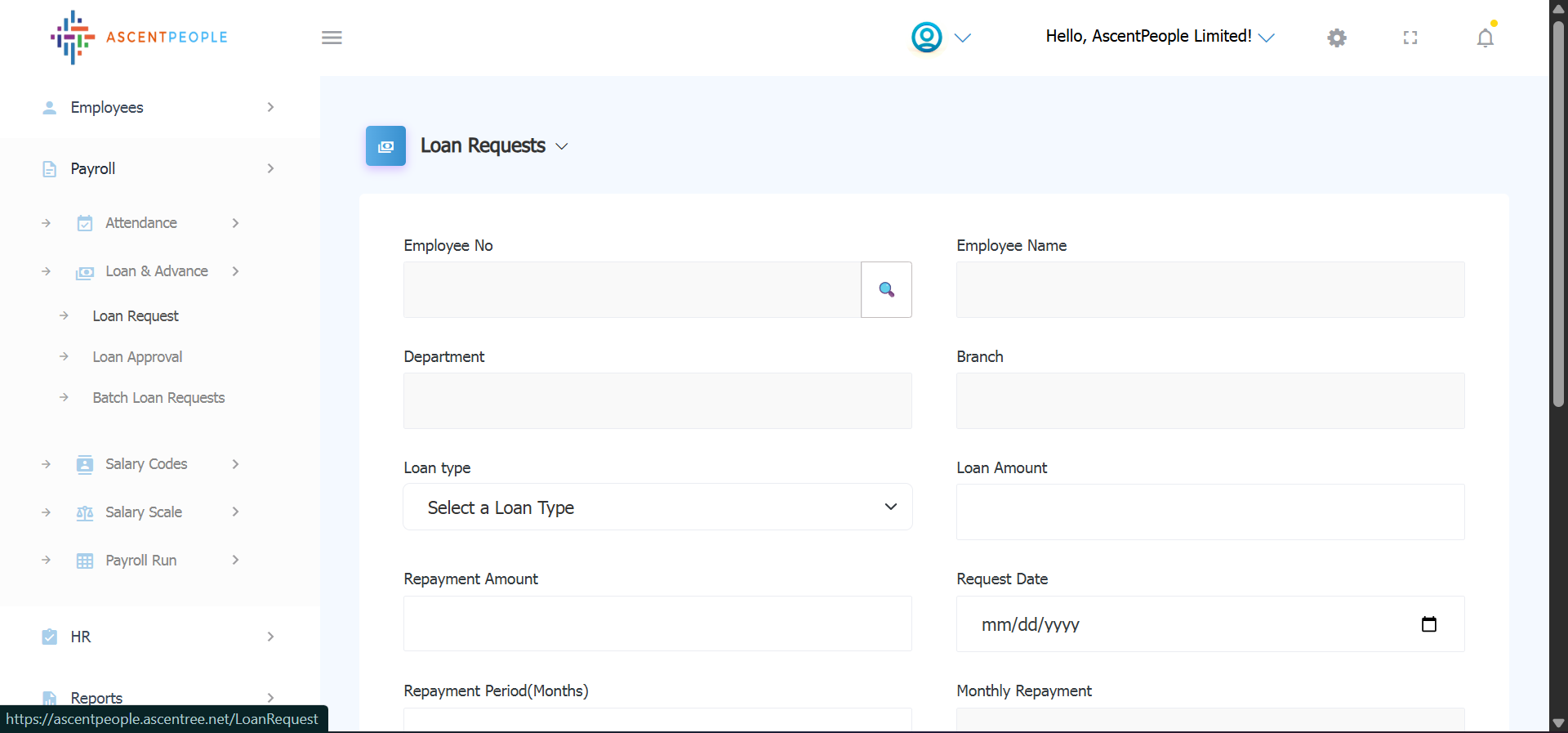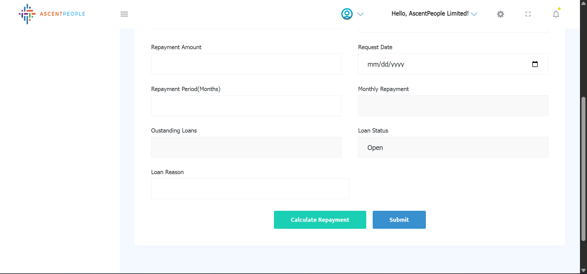 Once Employee No is set, Employee Name, Department, Branch are auto populated, select the Loan Type, Loan Amount, Repayment date, Request date and Repayment period, these fields are auto filled (Monthly repayment after clicking calculate repayment, Outstanding loans, Loan status), Type in Loan reason, click submit to submit the loan request.