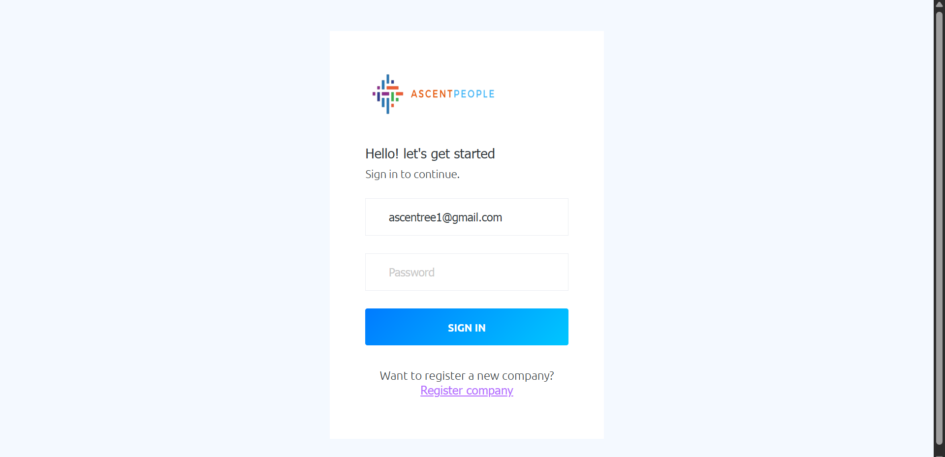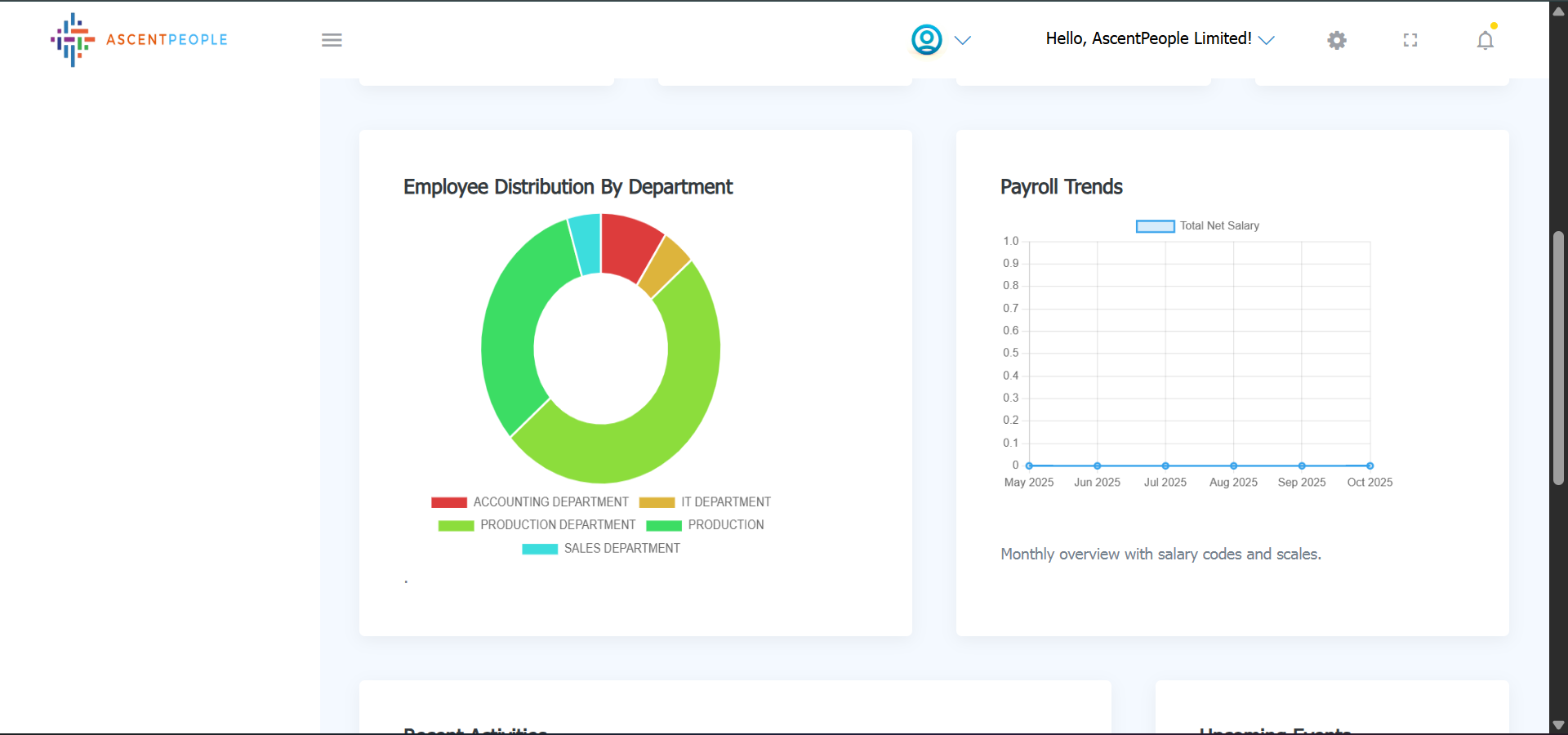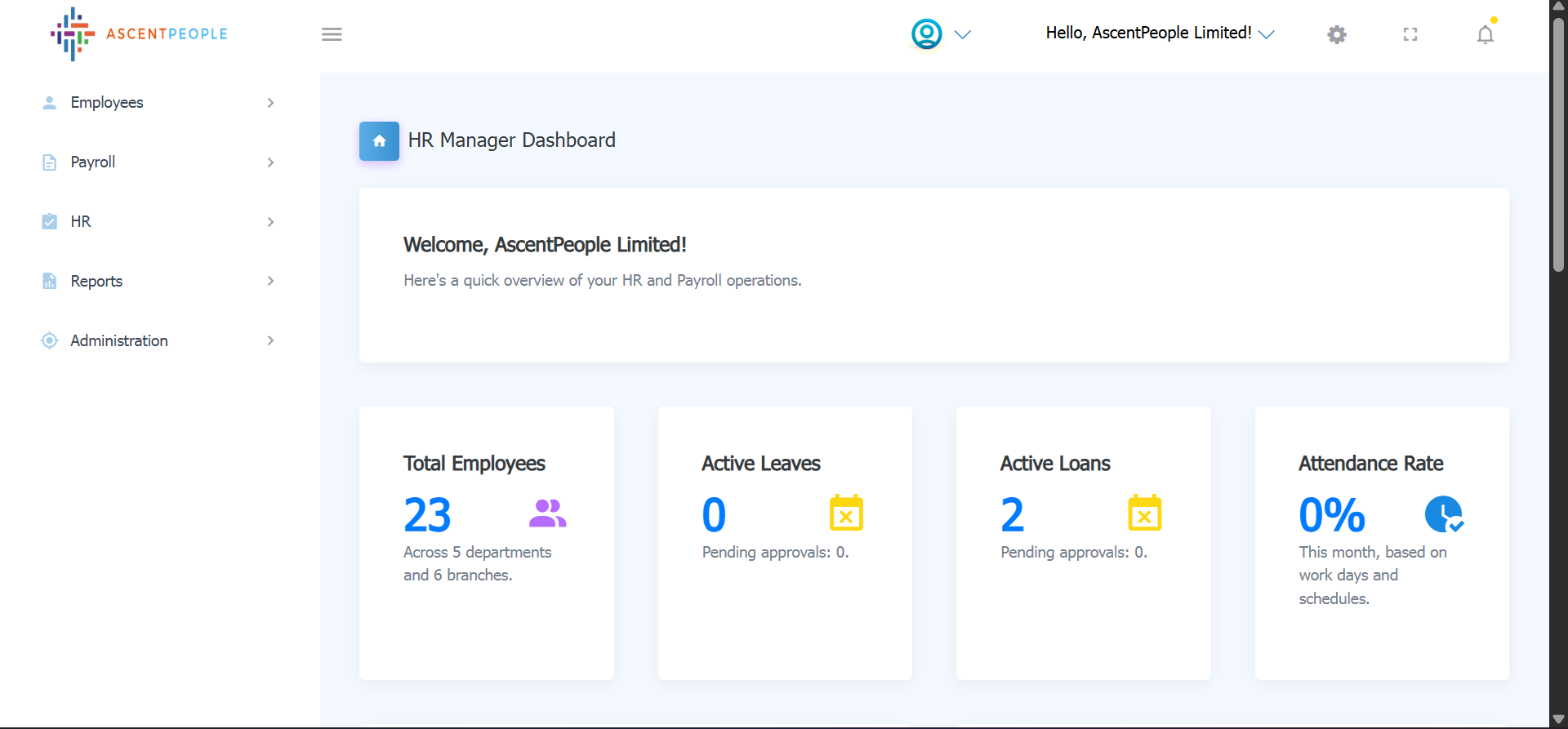 The first page the users sees is the dashboard which gives an overview of the company and actions to different modules relevant to the user.
