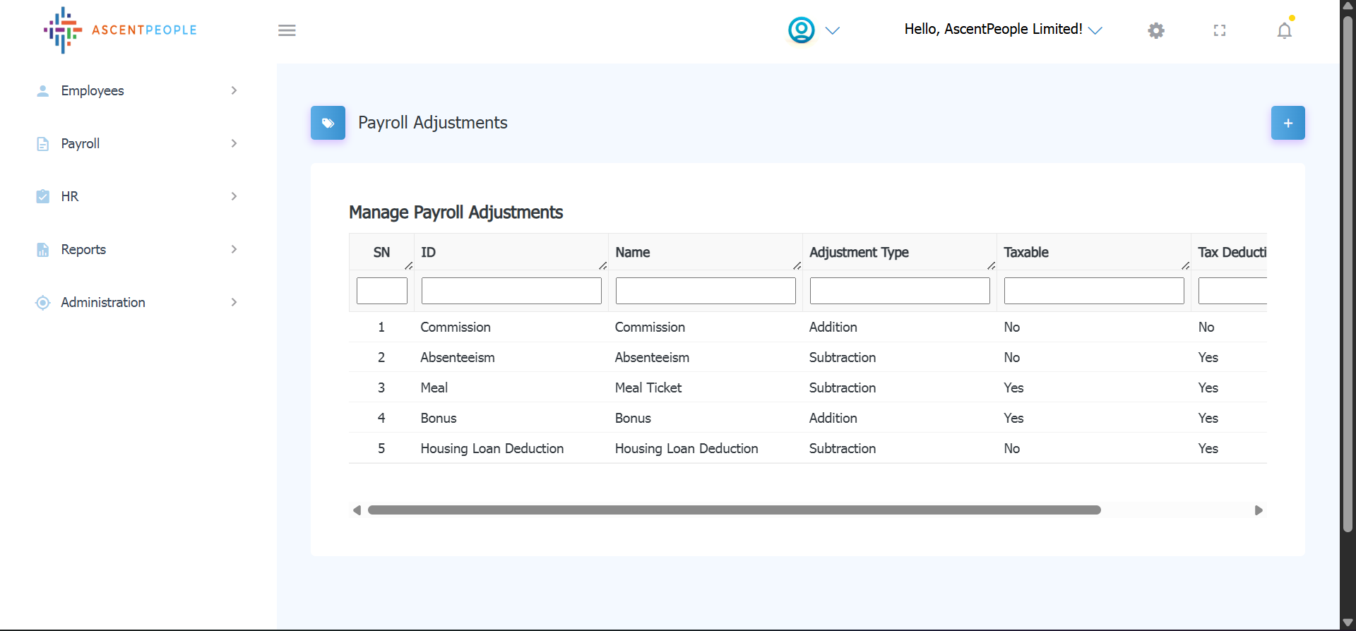This is a list of the payroll adjustments created on the system.