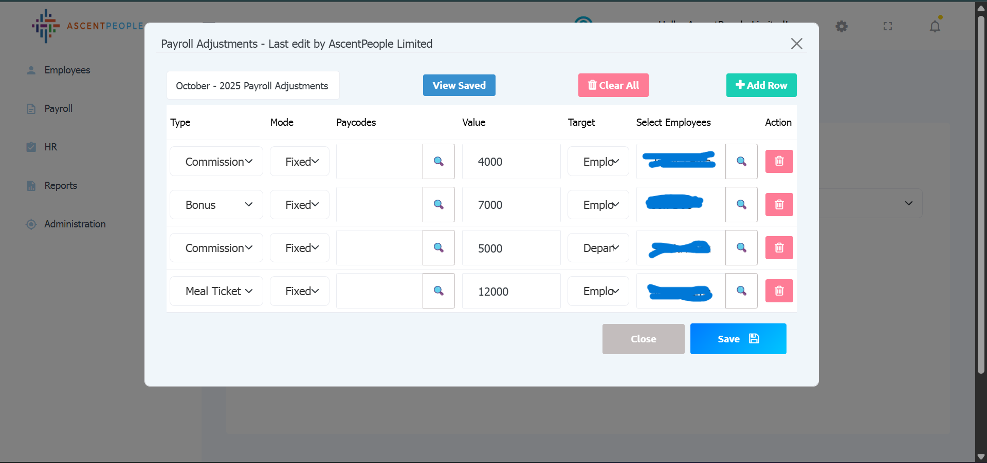 To add adjustments before running payroll. Set the payroll adjustments general name so when saved, it can be reused by clicking view saved. Select the Type (payroll adjustment), the mode (if fixed then input the amount, if percentage is selected then the percentage value should be set and applicable paycodes should be selected as well), the target for those adjustments (branch, department, employee), the employees the adjustment should be applied to, Multiple rows can be added depending on how many adjustments need to be made. Then click save.
