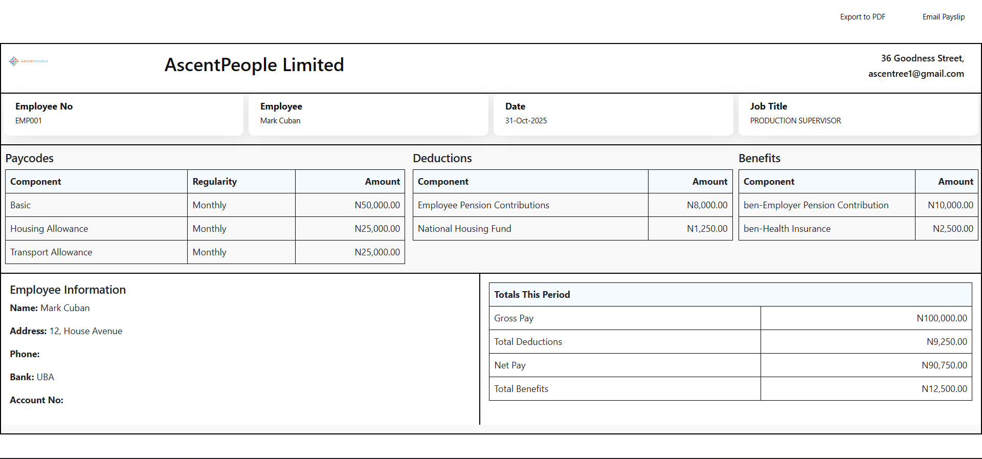 This can be exported to PDF or payslip can be emailed to the employees, the buttons are at the top right.