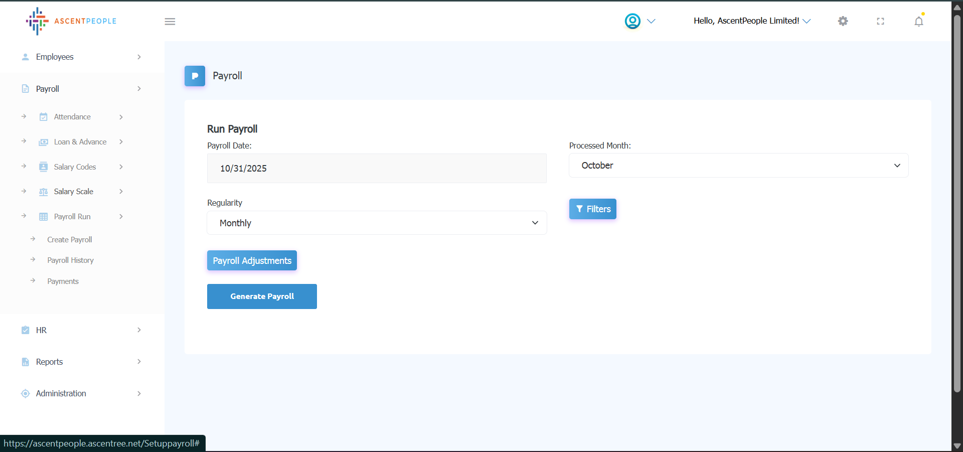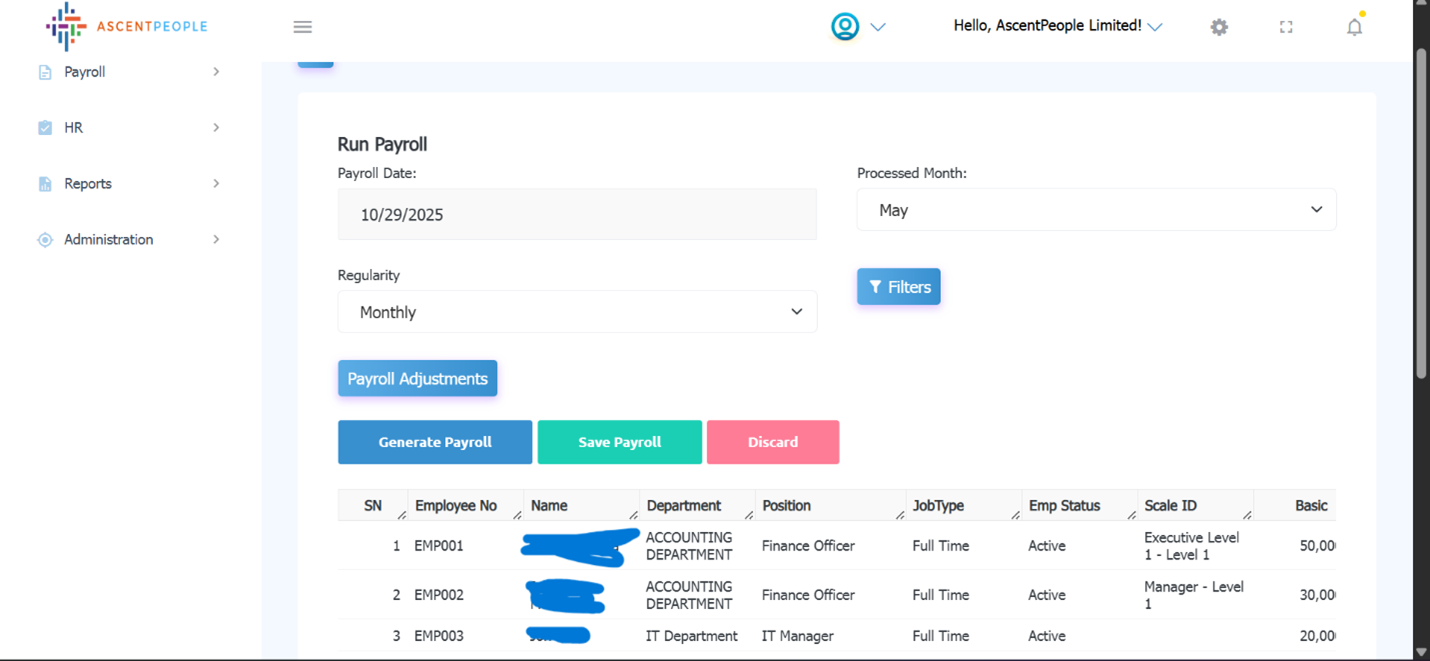 i. Payroll Date is automatically set as the current date, set the processed month (the month you want to run payroll for), select the regularity value. If need be, set the filters and the adjustments.